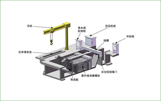 紫外線的殺菌原理是利用紫外光的能量破壞水體中各種病毒、細菌及其它致病體的DNA,紫外線穿透微生物的細胞膜和細胞核,破壞核酸的分子鍵,使其失去復制能力或活性而死亡。紫外線殺菌波段介于200~300nm之間,其中以253.7nm波段能力最強。紫外線消毒設備安裝在消毒水渠內,用于殺滅經(jīng)二級生化處理后的污水中的細菌、病毒。通常由以下幾部分構成:紫外燈模塊組(紫外燈管、石英套管、電子鎮(zhèn)流器、模塊機架等)、模塊支架、紫外線強度監(jiān)測系統(tǒng)、低水位傳感器、系統(tǒng)控制中心、單渠控制柜、起吊裝置、導流板、自動清洗系統(tǒng)、清洗驅動系統(tǒng)、水位控制系統(tǒng)等。